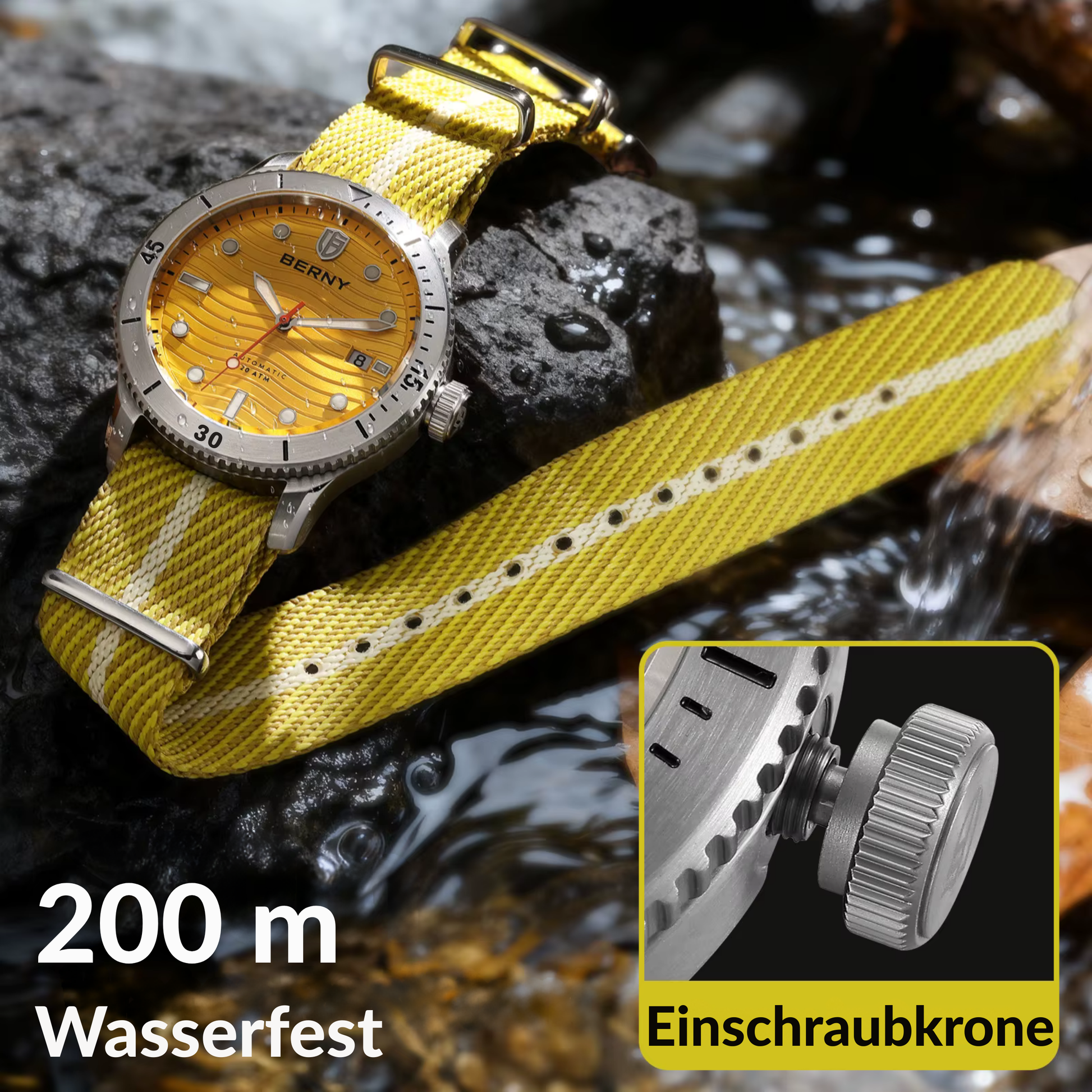 Étanche jusqu'à 200 m, cette montre est conçue pour les plongeurs exigeants et les passionnés d'activités de plein air ; idéale pour la natation, la plongée avec tuba et les explorations sous-marines. Son écran ultra-lumineux offre une lisibilité optimale même dans l'obscurité la plus totale, grâce à une luminescence puissante et durable.